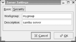 Preferences Figure 11-4. The Basic tab of the Server Settings dialog box![]() The Security tab (Figure 11-5) enables you to specify options that control access to your server and the file and printer shares it provides. Figure 11-5. The Security tab of the Server Settings dialog box![]() The most important security option is the authentication mode, which determines how the server decides who can use which shared files and printers. The dialog box provides five authentication modes from which you can choose: