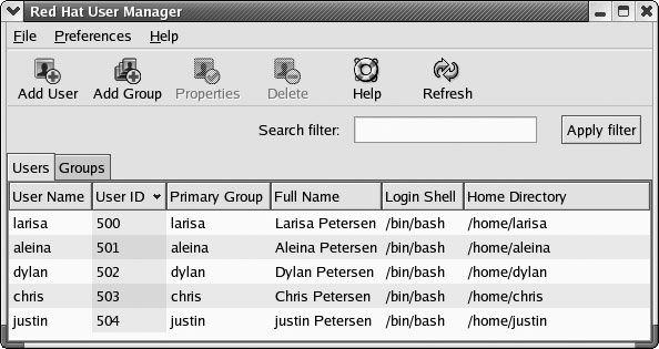 Currently, the easiest and most effective way to add new users on Red Hat is to use redhat-config-users, also known as the Red Hat User Manager. You can access it from the GNOME desktop's Start Here window's System Settings window. The redhat-config-users window will display panels for listing both users and groups (see Figure 4-2). A button bar will list various tasks you can perform, including creating new users or groups, editing current ones (Properties), or deleting a selected user or group.