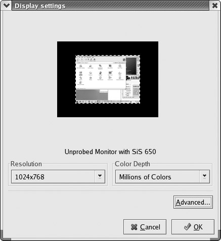 If you have trouble with your X Window System configuration, you can use redhat-config- xfree86 to configure it again. This tool is also helpful for updating your X Window System if you change your video card. Simply run the tool again and select the appropriate card. You can run redhat-config-xfree86 by selecting Display on the System Settings window or menu. The redhat-config-xfree86 tool first opens a Display Settings window (shown in Figure 4-4) with pop-up menus for selecting your resolution and color depth.