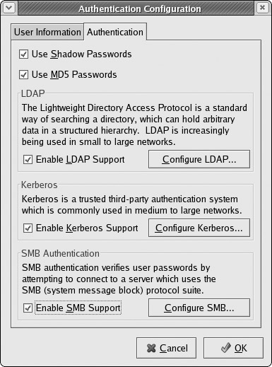 To further control access to your system is to provide secure user authentication with encrypted passwords, a Lightweight Directory Access Protocol (LDAP) service, and Pluggable Authentication Modules (PAM) (see Chapter 28). User authentication can further be controlled for certain services by Kerberos servers (see Chapter 18). Kerberos authentication provides another level of security whereby individual services can be protected, allowing use of a service only to users who are cleared for access. LDAP and Kerberos are all enabled and configured with authconfig-gtk (Authentication in the System Settings menu or window).