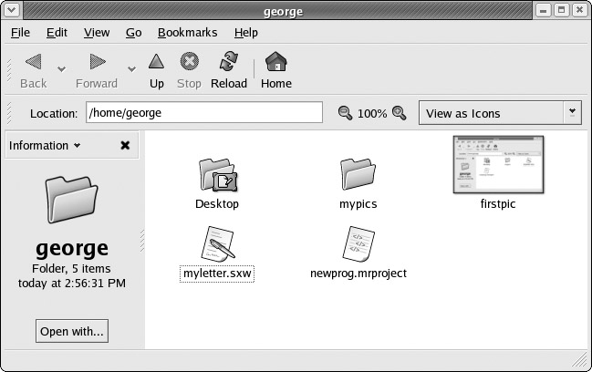 The Nautilus file manager operates similarly to a Web browser. It maintains a list of previously viewed directories, and you can move back and forth through that list using the toolbar buttons. The left arrow button moves you to the previously displayed directory, and the right arrow button moves you to the next displayed directory. The up arrow button moves you to the parent directory, and the Home button moves you to your home directory. To use a pathname to go directly to a given directory, you can type the pathname in the Location box and press ENTER.