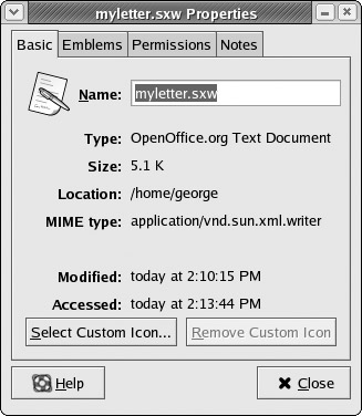 With the Properties dialog box, you can view detailed information on a file and set options and permissions (see Figure 6-3). A Properties box has four panels: Basic, Emblems, Permissions, and Notes. The Basic panel shows detailed information such as type, size, location, and date modified. The type is a MIME type, indicating the type of application associated with it. The file's icon is displayed at the top with a text box showing the file's name. You can edit the filename in this text box, changing that name. A button at the bottom labeled Select Custom Icon will open a dialog box showing available icons you can use. You can select the one you want from that window. The Remove Custom Icon button will restore the default icon image. The Emblems panel enables you to set the emblem you want displayed for this file, displaying all the emblems available. The Permissions panel shows the read, write, and execute permissions for user, group, and other, as set for this file. You can change any of the permissions here, provided the file belongs to you. The panel will also show the file's owner and its group. The group name expands to a pop-up menu listing different groups, allowing you to select one to change the file's group. The Notes panel will list any notes you want to make for the file or directory. It is an editable text window, so you can change or add to your notes, directly.