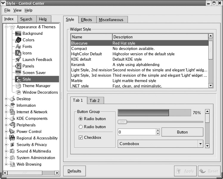 The Control Center window is divided into two panes. The left pane shows a tree view of all the components you can configure, and the right pane displays the dialog windows for a selected component. On the left pane, components are arranged into categories whose titles you can expand or shrink. The Web Browsing heading holds entries for configuring the KDE file manager's Web browser features. Under Appearances & Themes, you can set different features for displaying and controlling your desktop. For example, the Background entry enables you to select a different background color or image for each one of your virtual desktops. Other entries enable you to configure components such as the screen saver, the language used, and the window style. The Peripheral heading holds entries that let you configure your mouse, keyboard, and printer. The Internet and Network heading lets you specify common network settings like your e-mail address. The Sound and Multimedia heading contains panels for configuring sound components. From the Control Center, you can also access a set of specialized KDE system configuration tools. Currently these include a login and a font manager.