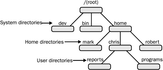 The Linux file structure branches into several directories beginning with a root directory, /. Within the root directory several system, directories contain files and programs that are features of the Linux system. The root directory also contains a directory called home that contains the home directories of all the users in the system. Each user's home directory, in turn, contains the directories the user has made for their own use. Each of these could also contain directories. Such nested directories would branch out from the user's home directory, as shown in Figure 10-2.