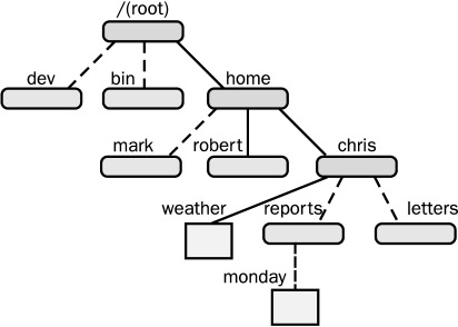The name you give to a directory or file when you create it is not its full name. The full name of a directory is its pathname. The hierarchically nested relationship among directories forms paths, and these paths can be used to identify and reference any directory or file unambiguously. In Figure 10-3, a path exists from the root directory, /, through the home directory to the robert directory. Another path exists from the root directory through the home and chris directories to the reports directory. Although parts of each path may at first be shared, at some point they differ. Both the directories robert and reports share the two directories root and home. Then they differ. In the home directory, robert ends with robert, but the directory chris then leads to reports. In this way, each directory in the file structure can be said to have its own unique path. The actual name by which the system identifies a directory always begins with the root directory and consists of all directories nested above that directory.