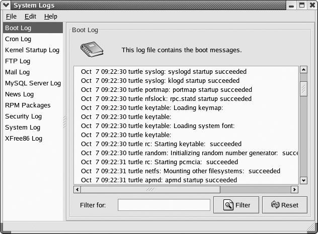 You can manage and view logs with the Red Hat Log Viewer, redhat-logviewer (System Tools | System Logs). The Red Hat Log Viewer displays a list of all current system logs in a left pane (see Figure 27-2). Clicking a log displays the contents of that log in the left pane. Use the Filter box to enter patterns you wish to look for, and click the Filter button to perform the match. Reset restores the complete listing. In the Preferences dialog, the Log Files panel lets you select a different location for a log file. The Alerts panel lets you create alert words. An alert icon is displayed next to any entry containing an alert word. Configuration settings, such as log file locations and alert words, are kept in the /etc/sysconfig/redhat-logviewer file.