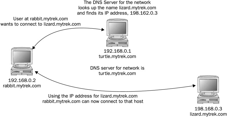 When a user enters a fully qualified domain name to access a remote host, a resolver program queries the local network's DNS server requesting the corresponding IP address for that remote host. With the IP address, the user can then access the remote host. In Figure 34-1, the user at rabbit.mytrek.com wants to connect to the remote host lizard.mytrek.com. rabbit.mytrek.com first sends a request to the network's DNS server—in this case, turtle.mytrek.com—to look up the name lizard.mytrek.com and find its IP address. It then returns the IP address for lizard.mytrek.com, 192.168.0.3, to the requesting host, rabbit.mytrek.com. With the IP address, the user at rabbit.mytrek.com can then connect to lizard.mytrek.com.