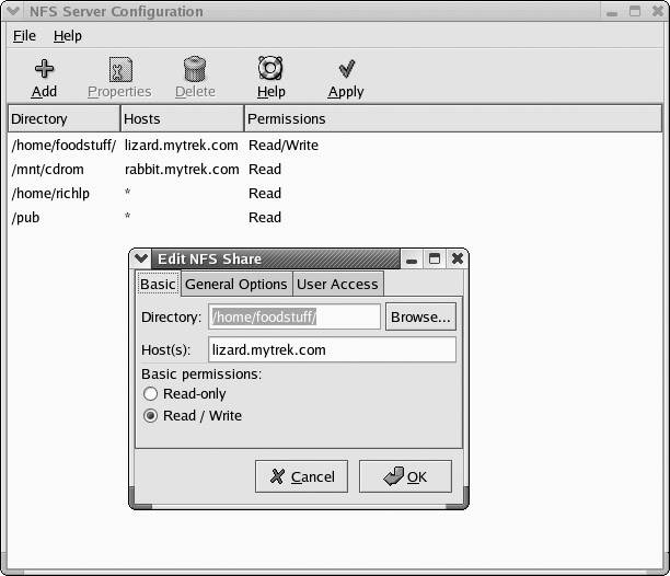 When you click OK, the entry will be listed in the NFS Server Configuration window. Changes do not take effect until you click Apply. This will create an entry in the /etc/exports file for the shared directory. You can later change any of these settings by selecting the entry and clicking Properties to open an Edit dialog box. To save your settings, click Apply.
