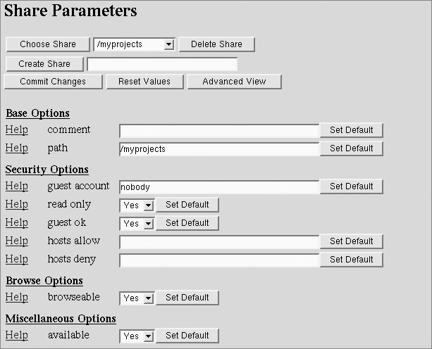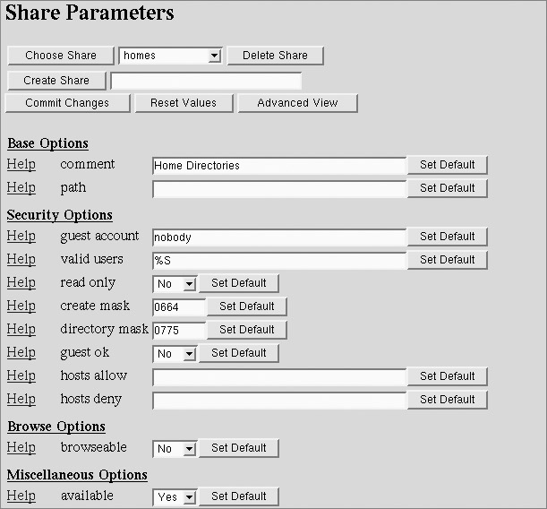 For the various sections, SWAT can display either a basic or advanced version. The basic version shows only those entries needed for a simple configuration, whereas the advanced version shows all the possible entries for that type of section. A button— labeled Advanced View and Basic View, respectively—is at the top of the section page for toggling between the advanced or basic versions (see Figure 37-3). Section pages for printers and shares have added buttons and a menu for selecting the particular printer or share you want to configure. The term "share," as it's used here, refers to directories you want to make available through Samba. When you click the SHARES button, you initially see only a few buttons displayed at the top of the SHARES page. You use these buttons to create new sections or to edit sections already set up for shares. For setting up a new Share section, you enter its name in the box next to the Create Share button and then click that button. The new share name appears in the drop-down menu next to the Choose Share button. Initially, this button is blank. Click it to display the list of current Share sections. Select the one you want, and then click the Choose Share button. The page then displays the entries for configuring a share. For a new share, these are either blank or default values. For example, to select the Homes section that configures the default setting for user home directories, click the drop-down menu where you find a Homes entry. Select it, and then click the Choose Share button. The entries for the Homes section are displayed. The same process works for the Printers page, where you can select either the Printers section or Create sections for particular printers.