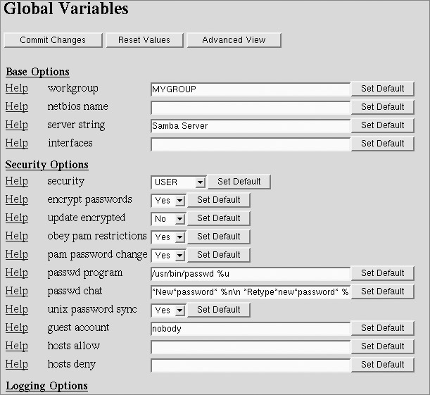 When you finish working on a section, click the Commit Changes button on its page to save your changes. Do this for each separate page you work on, including the GLOBALS page. Clicking the Commit Changes button generates a new version of the smb.conf file. To have the Samba server read these changes, you then have to restart it. You can do this by clicking the Restart smb button on the Status page.