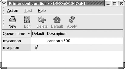 When you start up redhat-config-printer, you are presented with a window that lists your installed printers (see Figure 4-3). To add a new printer, click New. To edit an installed printer, double-click its entry, or select it and click Edit. Once you have made your changes, you can click Apply to save your changes and restart the printer daemon. If you have more than one printer on your system, you can make one the default by selecting it and then clicking Default. The Delete button will remove a printer configuration. You can test your printer with a PostScript, A4, or ASCII test sheet selected from the Test menu.
