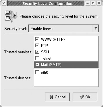 To set up your firewall, run redhat-config-securitylevel on your system (Security Level in the System Settings window and menu). You can enable or disable your firewall (see Figure 5-5). The None option disables the firewall. You can run your firewall on a stand-alone system directly connected to the Internet, or on a gateway system that connects a local network to the Internet (as described in the previous sections). For a local network, be sure that the local hosts do not have any kind of firewall running. The firewall should run only on the gateway. Furthermore, the gateway will have at least two network connections, one for the local network and an Internet connection device for the Internet. Make sure that the firewall is applied to the Internet device, not to your local network. On redhat-config-securitylevel, you do this by making the local network device a trusted device.