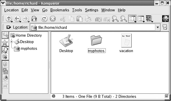 A KDE file manager window consists of a menu bar, a navigation toolbar, a location field, a status bar, and a sidebar that provided different views of user resources such as a tree view of file and directory icons for your home directory. When you first display the file manager window, it displays the file and subdirectory icons for your home directory. Files and directories are automatically refreshed. So if you add or remove directories, you do not have to manually refresh the file manager window. It automatically updates for your listing, showing added files or eliminating deleted ones. The files listed in a directory can be viewed in several different ways. You can view files and directories as icons, as small icons, or in a detailed listing. The detailed listing provides permissions, owner, group, and size information. Permissions are the permissions controlling access to this file (see Chapter 28). Configuration files, known as hidden files, are not usually displayed. To have the file manager display these files, select Show Hidden Files from the View menu. Konqueror also supports split views, letting you view different directories in the same window (Windows menu). You can split vertically or horizontally.