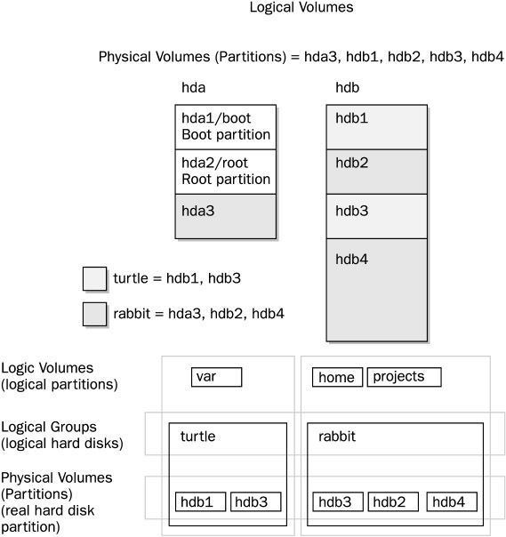 In an LVM structure, LVM physical partitions, also known as extents, are organized into logical groups, which are in turn used by logical volumes. In effect, you are dealing with three different levels of organization. At the lowest level, you have physical volumes. These are physical hard disk partitions that you create with partition creation tools such as parted or fdisk. The partition type can be any standard Linux partition type, such as ext3 or ext2. These physical volumes are organized into logical groups, known as volume groups, that operate much like logical hard disks. You assign collections of physical volumes to different logical groups. For example, if you have physical volumes consisting of the hard disk partitions hda2, hda3, hdb1, hdb2, and hdb3 on two hard disks, hda and hdb, you could assign some of them to one logical group and others to another logical group. The partitions making up the different logical groups can be from different physical hard drives. For example, hda2 and hdb3 could belong to the logical group turtle and hda3, hdb2, and hdb3 could make up a different logical group, say rabbit. The logical group name could be any name you want to give it. It is much like naming a hard drive.