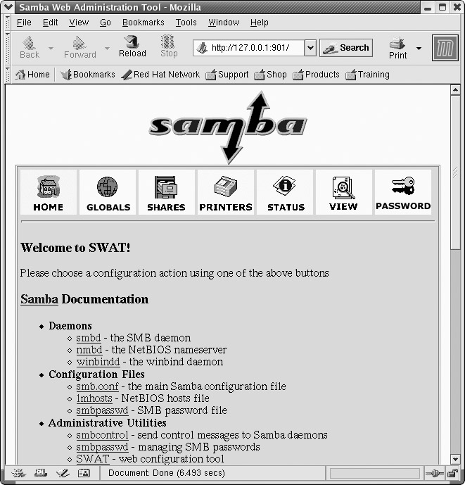 You can start SWAT by selecting the Samba Configuration entry in the GNOME or KDE System menu. This will open your Web browser to the SWAT page using the localhost IP address, 127.0.0.1 and port 901, as shown in Figure 37-2. You can also open your browser and enter the IP address 127.0.0.1 with port 901 to access SWAT.