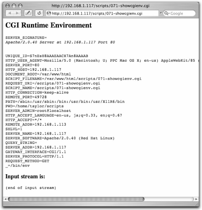 To run this code, you need to have the script executable and located on your web server. (See the earlier section "Running the Scripts in This Chapter" for more details.) Then simply request the saved .cgi file within a web browser.