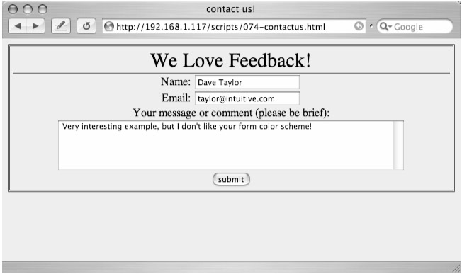 Remember that every CGI script needs to be readable and executable by everyone. To use this contact form, you need to save the HTML document somewhere on your site, perhaps on your home page or on another page called contactus.html. It might look like Figure 8-4.