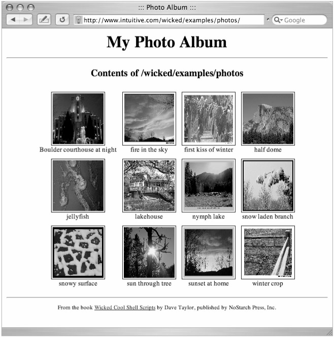 One limitation of this strategy is that the full-size version of each picture must be downloaded for the photo album view to be shown; if you have a dozen 100K picture files, that could take quite a while for someone on a modem. The thumbnails aren't really any smaller. The solution is to automatically create scaled versions of each image, which can be done within a script by using a tool like ImageMagick. Unfortunately, very few Unix installations include sophisticated graphics tools of this nature, so if you'd like to extend this photo album in that direction, start by learning more about the ImageMagick tool at http://www.imagemagick.org/