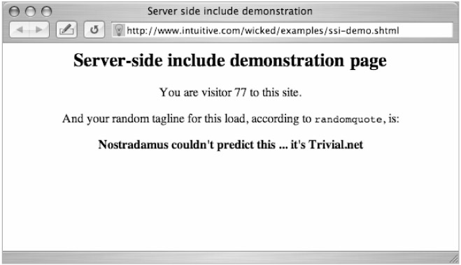 A short SSI page that includes a call to the counter.sh script is shown in Figure 8-7. This same HTML page also uses Script #76, Displaying Random Text.