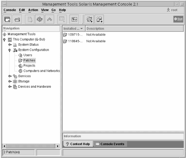 The Solaris Management Console includes a Patch Tool that enables you to view installed patches, add new patches, and add new patches to multiple systems at once. When you install Solaris 9 and open Patch Tool, it informs you that in order to achieve full functionality, you must download and install the PatchPro application from www.sun.com/PatchPro. If you download PatchPro, the Patch Tool can also analyze your system for patch needs and download them from the Internet for you. Sun insists that the process is secure and that no information about your computer is transmitted to Sun. Patch Tool is shown in Figure 2.5.