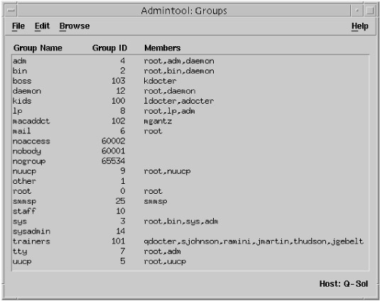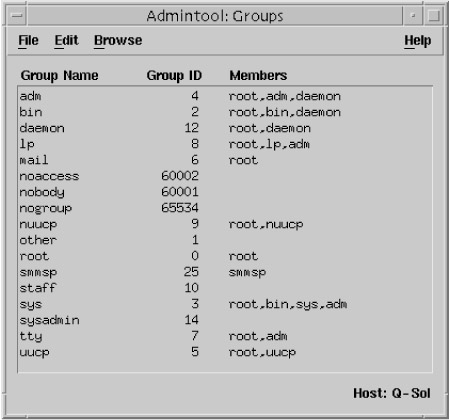 The Admintool and Solaris Management Console are available for managing groups as well as users. In Admintool, click Browse ➣ Groups to see a group listing. Groups can be added, modified, and deleted from the Edit menu. Even though Admintool is older and has fewer features than SMC, it does have one very useful element: it shows the members of the groups. Figure 4.5 shows the Groups node of Admintool.