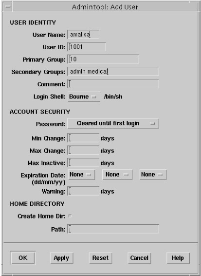 Admintool is the interface that many Solaris administrators are used to. However, when you open Admintool in Solaris 9, you receive a warning: Admintool will be phased out, so you had better find another tool you like. To view users in Admintool, open the utility and choose Browse ➣ Users. Adding, modifying, and deleting users is done from the Edit menu. The Admintool: Add User window is shown in Figure 4.2.
