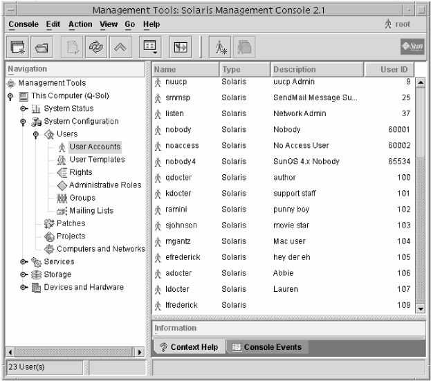 The new graphical user management tool of choice is the Solaris Management Console (SMC). The graphics in the SMC are much better than the ones in Admintool, and SMC gives you more options for managing users. For example, you can add multiple users with a wizard, assign rights to users, create user account templates, and set user policies.