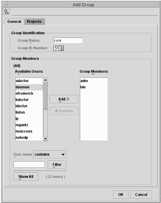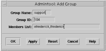 Adding a group in Admintool is easy. Choose Edit ➣ Add to access the window shown in Figure 4.6. Supply a group name, GID, and group members.