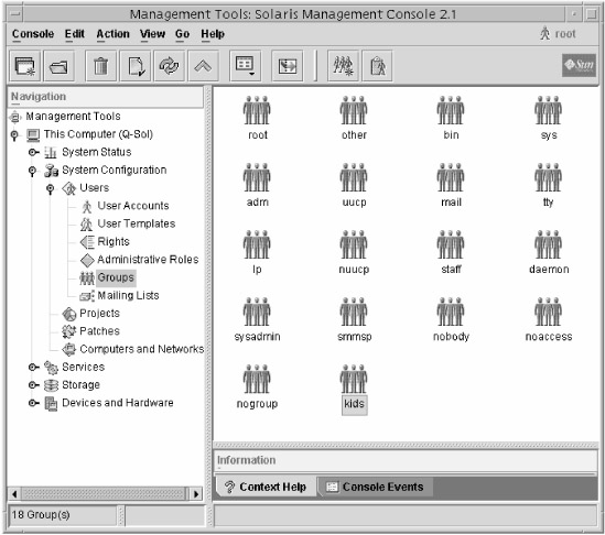 It's true that the SMC often outperforms Admintool. However, group management in SMC has some minor inconveniences. When viewing groups in the SMC main window, you can see the group name and GID, but you can't see the group members. To view group members, you must double-click the group to view its properties. The Groups node of SMC is shown in Figure 4.7.