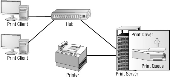 In a networked environment, you will have one or more print servers and many print clients. A print client is any machine that prints to the print server. In a stand-alone environment, the print client is the same computer as the print server.