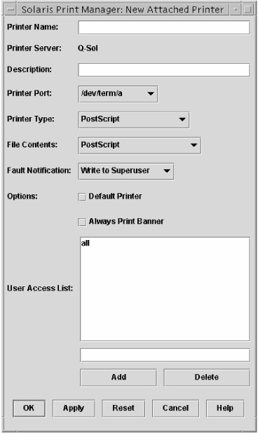 After you have chosen a computer to be the print server, attached the printer, and turned the printer on, you need to add the printer to Solaris. Open Solaris Print Manager and follow these steps: