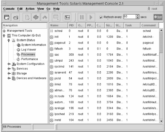 By using the Solaris Management Console, you can manage processes through a graphical interface. Using the process management commands gives you greater control, but the graphical interface makes it easier to see the running processes.