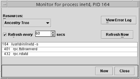In a process' Properties page, you can choose a variety of resources to examine under the Resources menu. Choices are Memory Map, Signal Statistics, Environment, Process Limits, Credentials, Dynamic Link Libraries, Ancestry Tree, Stack Trace, and File Descriptors. Basically, anything you could want to know about the process can be found here. The Ancestry Tree for the inetd process is shown in Figure 8.5. It shows that inetd, PID 164, is the parent process of PID 401 and PID 432.