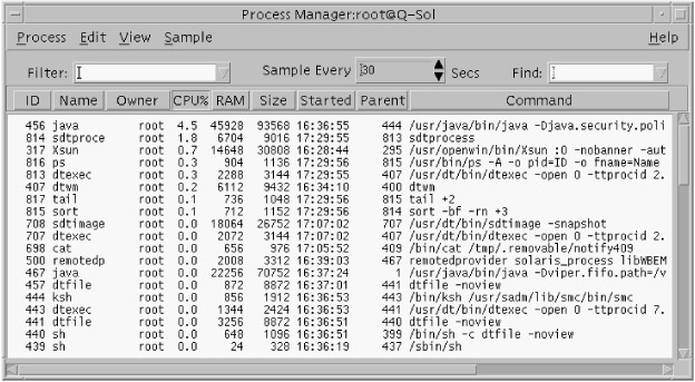 Process Manager is invoked by choosing Find Processes from the Tools menu in the CDE manager. Process Manager gives you more options for managing processes than does Solaris Management Console, including the ability to signal processes and kill the process outright.