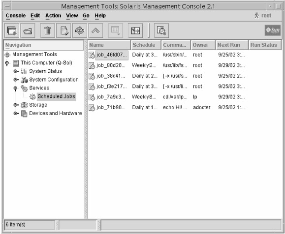 The Solaris Management Console can be used to view and create crontab jobs. The Scheduled Jobs node of the Solaris Management Console is shown in Figure 8.7.