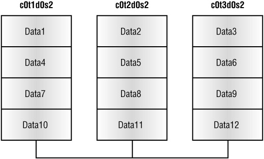 RAID 0 is known as disk striping. Solaris also implements a concatenation version of RAID 0. In RAID 0, data is written evenly across all disks that are part of the set, making the data appear as a "stripe" across all involved disks. To implement RAID 0, you need at least two hard disks.