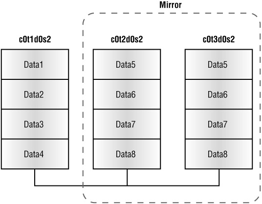 You will sometimes hear people refer to RAID 1 as disk duplexing. The difference between disk mirroring and disk duplexing is which disk controllers the hard disks are located on. If both disks in your set are on the same controller, it's a mirror. If they're on different controllers, it's a duplex. The difference is really only a technicality, as setting up a mirror is no different from setting up a duplex in Solaris. |