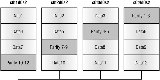 In a RAID 5 volume, you lose storage space equivalent to one component, for parity purposes. If you have three 10GB hard disks in a RAID 5 volume, you will have a 30GB volume capable of storing 20GB of data. If you have fifteen 10GB hard disks, you will have a 150GB volume capable of holding 140GB of data. Figure 12.3 shows a simple RAID 5 volume.