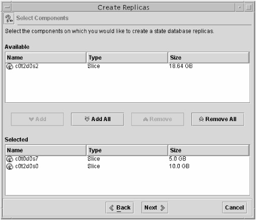 The state database is a collection of multiple replicated database copies. Each copy is known as a state database replica. You should create at least three replicas for the state database and place the replicas on different controllers and/or different hard disks for maximum reliability. Obviously, if you have only one hard disk, this is not possible, so place all three replicas on the same slice. Replicas can be placed on dedicated slices, but it's not necessary. Placing replicas on slices that will become part of a volume is acceptable.
