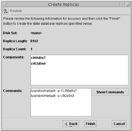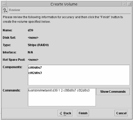 The last screen enables you to review your selections and shows you the commands that will be executed by the Solaris Volume Manager. To make any changes, use the Back button. If you are satisfied with your selections, click Finish.