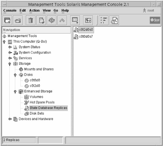 When the replicas are created, you will see them appear on the right side of the Solaris Management Console, as shown in Figure 12.5.