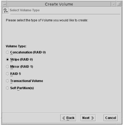 Solaris 9 supports two types of RAID 0 volumes: striped volumes and concatenated volumes. A striped volume, as you learned earlier in this chapter, writes data evenly across all member disks, making the written data appear to create a "stripe" among the disks.