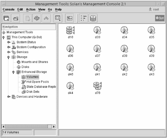 You can access the Solaris Volume Manager through one of two ways: a graphical interface or the command line. The graphical interface provided by the Solaris Management Console is easy to use and affords you complete flexibility when managing storage volumes. The Enhanced Storage node of the Solaris Management Console is shown in Figure 12.4.