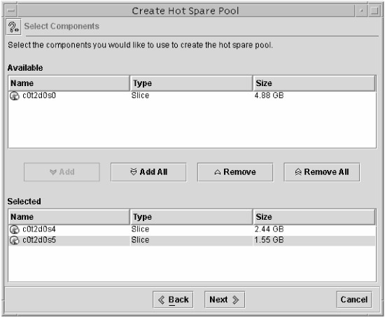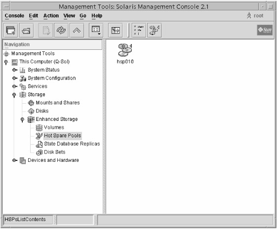 As with RAID volumes, hot spare pools can be managed from the command line or through the Solaris Management Console.