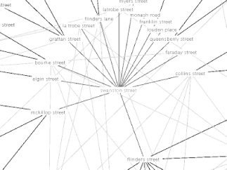 car Google Cartography (found here: http://richard.jones.name/google-hacks/google-cartography/google-cartography.html) uses Google via the Google Search API [Chapter 9] to build a visual representation of the interconnectivity of streets in an area. This application takes a starting street and finds streets that intersect with it. Traversing the streets in a breadth-first manner, the application discovers more and more intersections, eventually producing a graph that shows the interconnectivity of streets flowing from the starting street. Figures Figure 3-5 and Figure 3-6 show maps generated for two of the world's great cities, New York and Melbourne, respectively. Figure 3-5. New York, U.S., as determined by Google cartography![]() Figure 3-6. Melbourne, Australia, mapped by a little Google cartography![]()