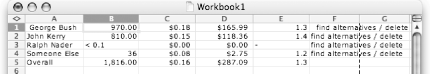 $ perl adwords_worth.pl "George Bush" "John Kerry" "Ralph Nader" "Someone Else" Fetching the Adwords initial page... ok Visiting the Language and Targeting page... ok Visiting the Country selector... ok Creating a placeholder ad... ok Plugging in your keywords... ok Recalculating keyword values... ok Gleaning keyword values and building you a CSV... "Keyword","Clicks /Day","AverageCost-Per-Click","Cost /Day","AveragePosition [?]" "George Bush","910.0","$0.21","$189.88","1.3" "John Kerry","810.0","$0.18","$138.36","1.4" "Ralph Nader","< 0.1","$0.00","$0.00","-" "Someone Else","33.0","$0.09","$2.67","1.2" "Overall","1771.0","$0.19","$334.62","1.3" 7.7.2.4 Hacking the hackThere are any number of ways you could slice and dice this hack:
