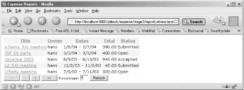 The only difference—compared to the getReportsModel( ) method we used previously—is that this method sorts the list by calling the sortReports() method before it populates the DataModel wrapper. Now we have all the code we need for sorting. Example 10-2 shows how the new methods are bound to components in the JSP page. Example 10-2. Reports list with sortable columns (expense/stage2/reportListArea.jsp)<%@ page contentType="text/html" %>