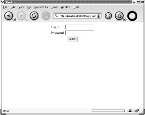 Creating a Custom Login FormWhen you use the FORM authentication method, you must supply a login form to prompt the user for a username and password. The login form must contain form elements named j_username and j_password. The action in the <form> tag must be j_security_check. Listing 23.3 shows the HTML source for an example login form. Listing 23.3 Source Code for LoginForm.html<html> <body bgcolor="#ffffff"> <form action="j_security_check"> <table border="0"> <tr> <td>Login</td> <td><input type="text" name="j_username"></td> </tr> <tr> <td>Password</td> <td><input type="password" name="j_password"></td> </tr> </table> <input type="submit" value="Login!"> </center> </form> </body> </html> Figure 23.2 shows the example login form after the user has tried to access a page that requires authentication. Figure 23.2. You can supply your own custom login form.