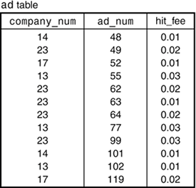 Figure 4.2 shows the same table, but with the addition of an index on the company_num column in the ad table. The index contains an entry for each row in the ad table, but the index entries are sorted by company_num value. Now, instead of searching through the table row by row looking for items that match, we can use the index. Suppose that we're looking for all rows for company 13. We begin scanning the index and find three values for that company. Then we reach the index value for company 14, which is higher than the one we're looking for. Index values are sorted, so when we read the index record containing 14, we know we won't find any more matches and can quit looking. Thus, one efficiency gained by using the index is that we can tell where the matching rows end and can skip the rest. Another efficiency comes about through the use of positioning algorithms for finding the first matching entry without doing a linear scan from the start of the index (for example, a binary search is much quicker than a scan). That way, we can quickly position to the first matching value and save a lot of time in the search. Databases use various techniques for positioning to index values quickly, but it's not so important here what those techniques are. What's important is that they work and that indexing is a good thing. Figure 4.2. Indexed ad table.