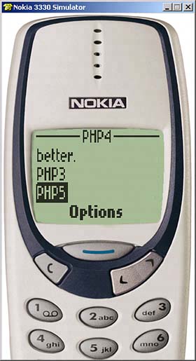 Before creating or converting a graphic, do consider that the graphics will not look as crisp as you might be used to from your website. Only one available color (black) is not much. Also, remember that displays are small, so try to shrink your company logo so that it fits. Figure 19.7 shows the PHP logo as WBMP. Figure 19.7. The PHP logo as WBMP.